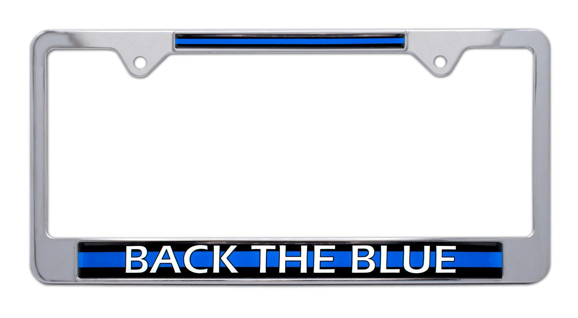 The Back the Blue License Plate Frame is a chrome license plate frame by Thin Blue Line Shop.
