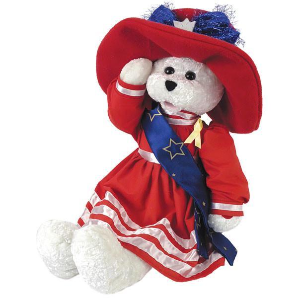 19" Betsy patriotic bear shows her American pride in her very spirited ensemble, including a red dress with white stripes, a blue sash with gold stars and a red hat with blue sparkling bow. She also has a yellow ribbon pin, in support of America's military troops. Head sways & mouth moves while singing, "God Bless America".
